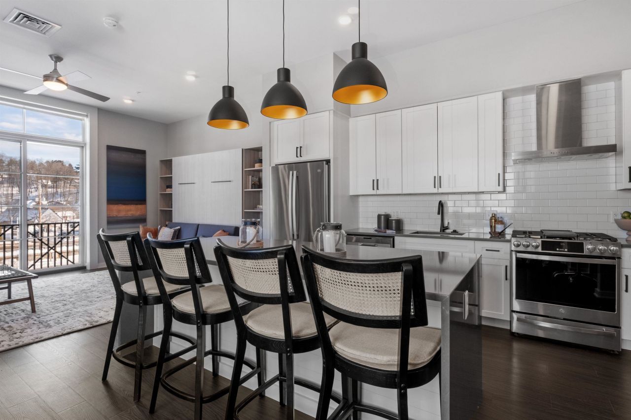 Welcome to 51 Elm Street, Unit 310, where effortless one-level living meets modern design in the heart of the Lakes Region, perfectly situated between Lake Winnipesaukee and Lake Opechee. This bright and open studio unit spans over 700 square feet, offering a seamless floor plan that's ideal for easy living and entertaining. The kitchen, centered around a stunning marble island, flows naturally into the living area, creating a functional and inviting space filled with natural light. Designer-grade finishes and premium materials throughout give the home a polished, contemporary feel that's both stylish and low-maintenance, perfect for a lock-and-leave lifestyle. Residents enjoy unmatched convenience with elevator access, attached covered parking, and no exterior upkeep to worry about. Building amenities include a state-of-the-art fitness center and a one-of-a-kind rooftop deck with sweeping views?an exclusive feature in the Lakes Region. From the dramatic arched entry to the tech-forward features throughout, Unit 310 delivers modern, maintenance-free living on one level, making it an ideal full-time residence, weekend escape, or in-town home just steps from dining, shopping, and waterfront recreation.