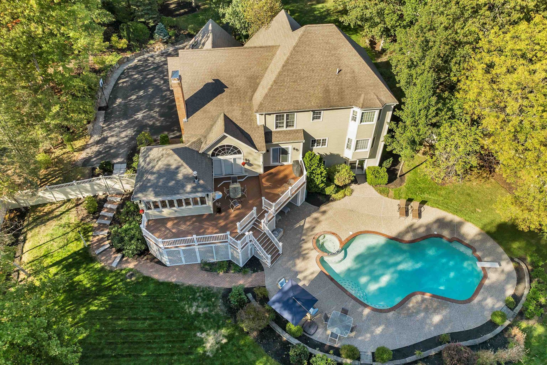 Located in one of the most sought-after neighborhoods, this exceptional 5-bedroom, 5-bath home offers the perfect blend of luxury, comfort, and lifestyle?complete with a private in-ground pool with spa oasis. Set on a level, beautifully landscaped lot with a fully fenced backyard, the home welcomes you with a warm, inviting layout. The main level features a spacious private office, a vaulted, light-filled family room with fireplace, and an open-concept chef's kitchen that flows seamlessly into the dining and living areas?all overlooking expansive decks, hot tub, pool, and serene wooded surroundings. A stunning four-season sunroom with vaulted ceilings and a gas stove provides year-round enjoyment of the outdoor setting. Upstairs, you'll find four generously sized bedrooms, including two with en-suite baths, plus an additional shared full bath. The front to back primary suite offers a sitting area, large walk-in closet, and spa-like bath with soaking tub and separate shower. Newly updated Laundry room, one of two! A bonus room above the garage and both front and rear staircases add flexibility and convenience. The finished light-filled walkout lower level expands the living space with a large open area, guest bedroom suite, additional rooms, abundant storage and the second large laundry room. Step outside to a resort-style backyard featuring multiple decks and patios, a covered cabana, and direct access from the lower level. Additional highlights include a three-car side-entry garage, new mudroom with built-ins, large storage areas, and mature trees for privacy and shade. Other updates and added features include closet expansions, decking, cabana, doors, cabinetry throughout, paint, renovated bathrooms, automatic whole house generator, and more. Be in time to enjoy the summer and all it has to offer! OPEN HOUSE SUNDAY APRIL 12TH 3P-5P